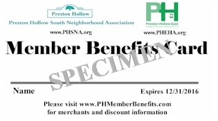 | Members of participating properties in the the Preston Hollow South Neighborhood Association and homeowners in the Preston Hollow East Homeowners Association may receive the discounts at selected area merchants. |
